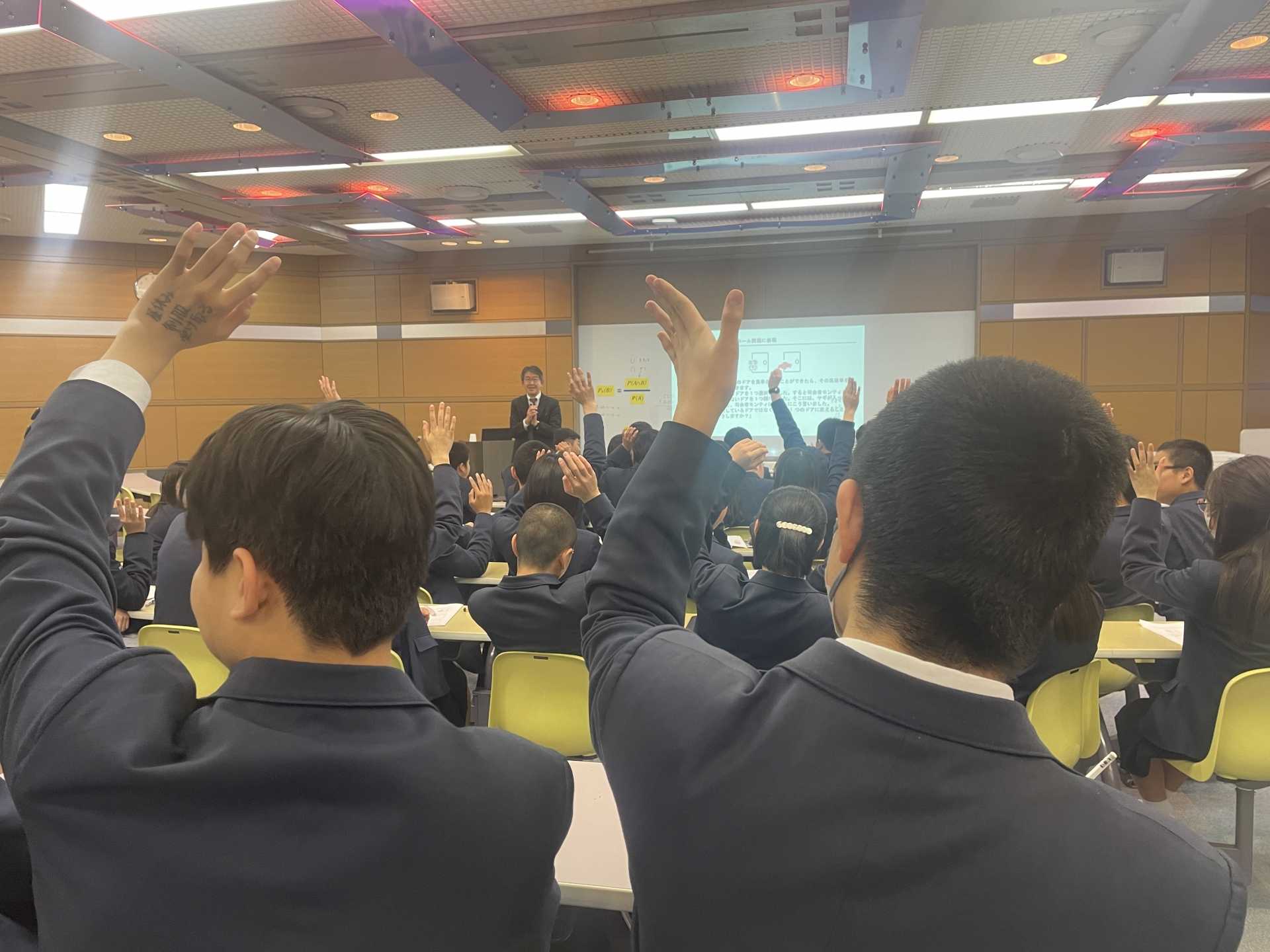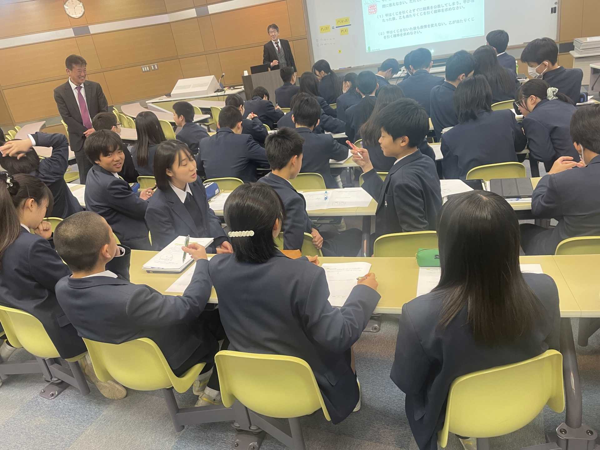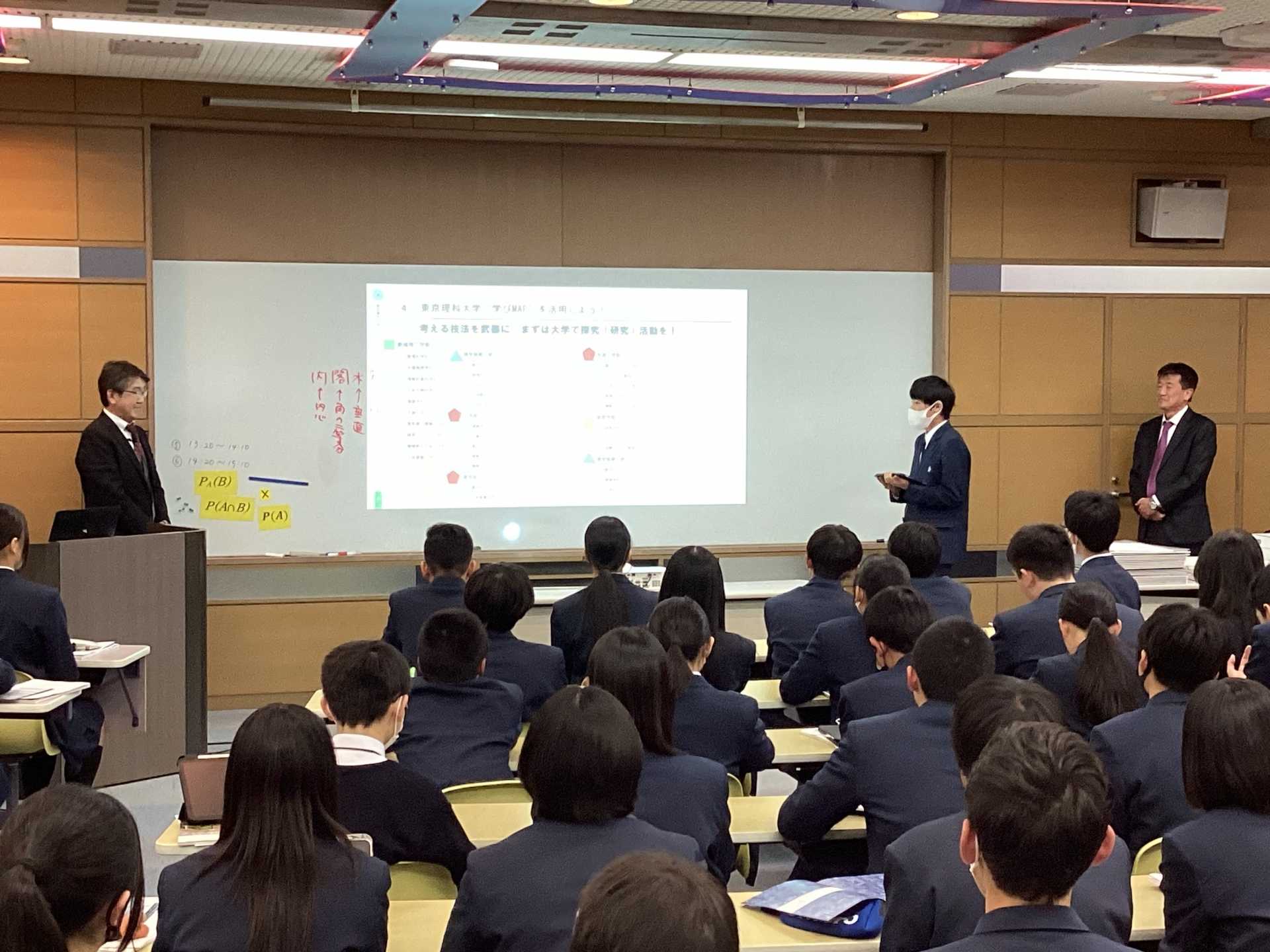 1月22日(木)、東京理科大学の松本明先生をお招きし、出前授業をしていただきました。5時間目の授業では、中学2年生を対象に条件付き確率の授業をしていただきました。中学数学ではまだ習わない分野ですが、生徒たちは与えられた問題に対して一生懸命に考え、たくさんの発言や協力する姿が見られました。