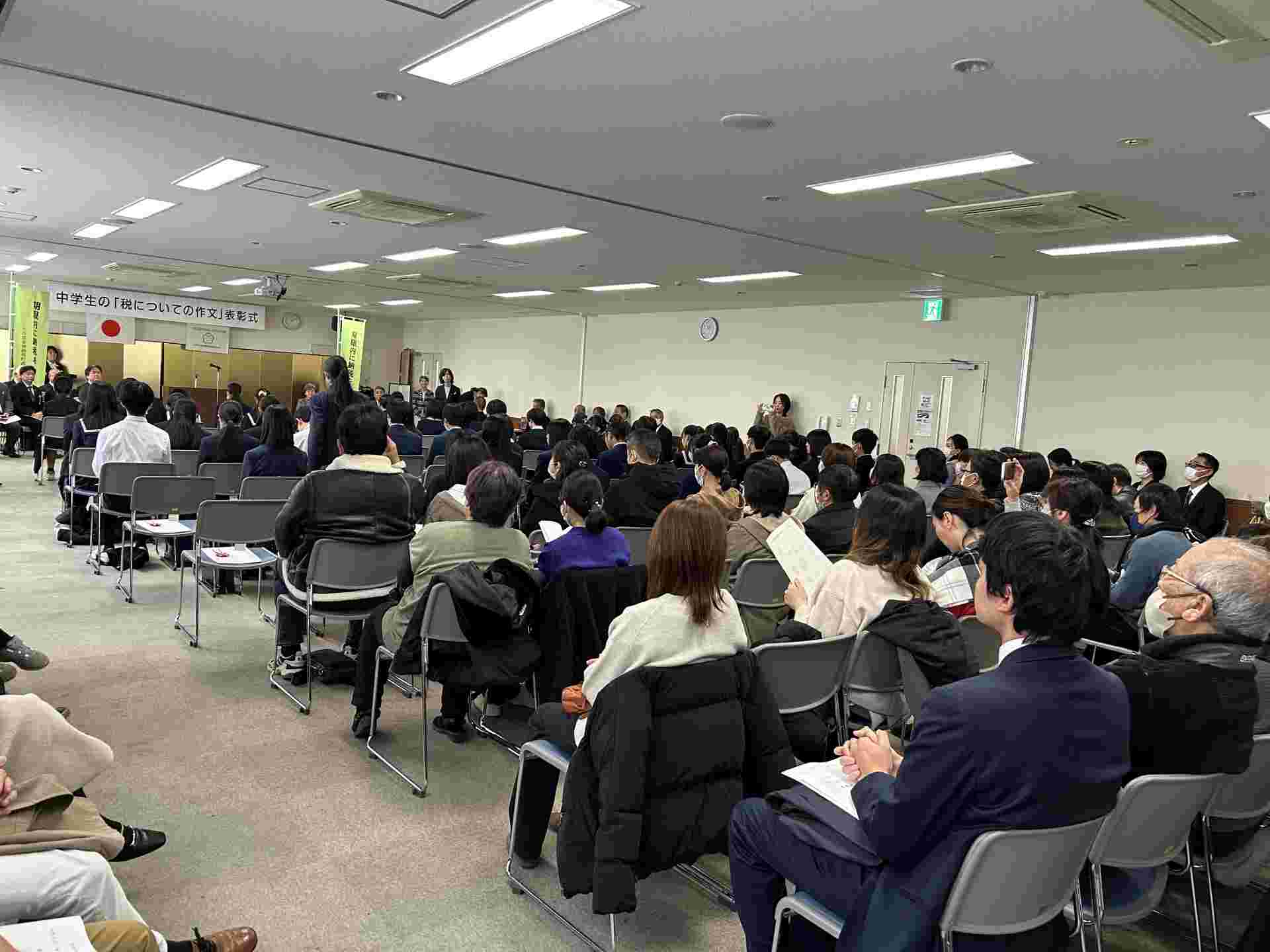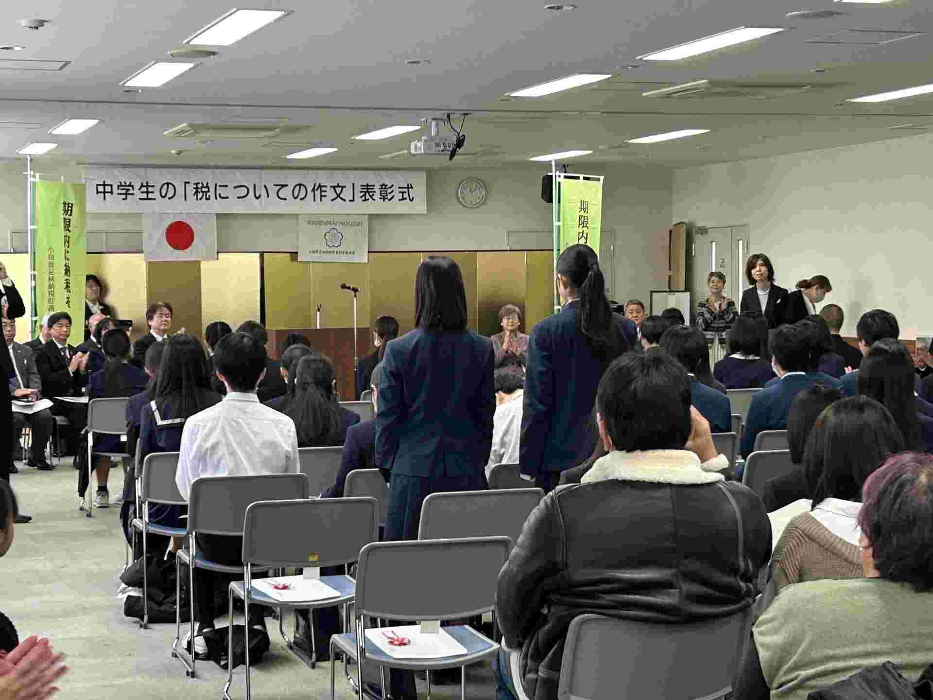 本校では8月の登校日に中学3年生を対象に、税理士の方をお招きして租税教室を行って税に対する意識を高め、夏休みの宿題としてこの「税についての作文」を全員に書いてもらっています。今回提出された作文をコンクールに出したところ、1800以上集まった作文の中から本校の3人の生徒の作文が見事入賞を果たしました。当日は体調不良で1人欠席してしまいましたが、2人の生徒が多くの来賓の方々がお越しになった表彰式に参加し、緊張した面持ちで表彰を受けてきました。