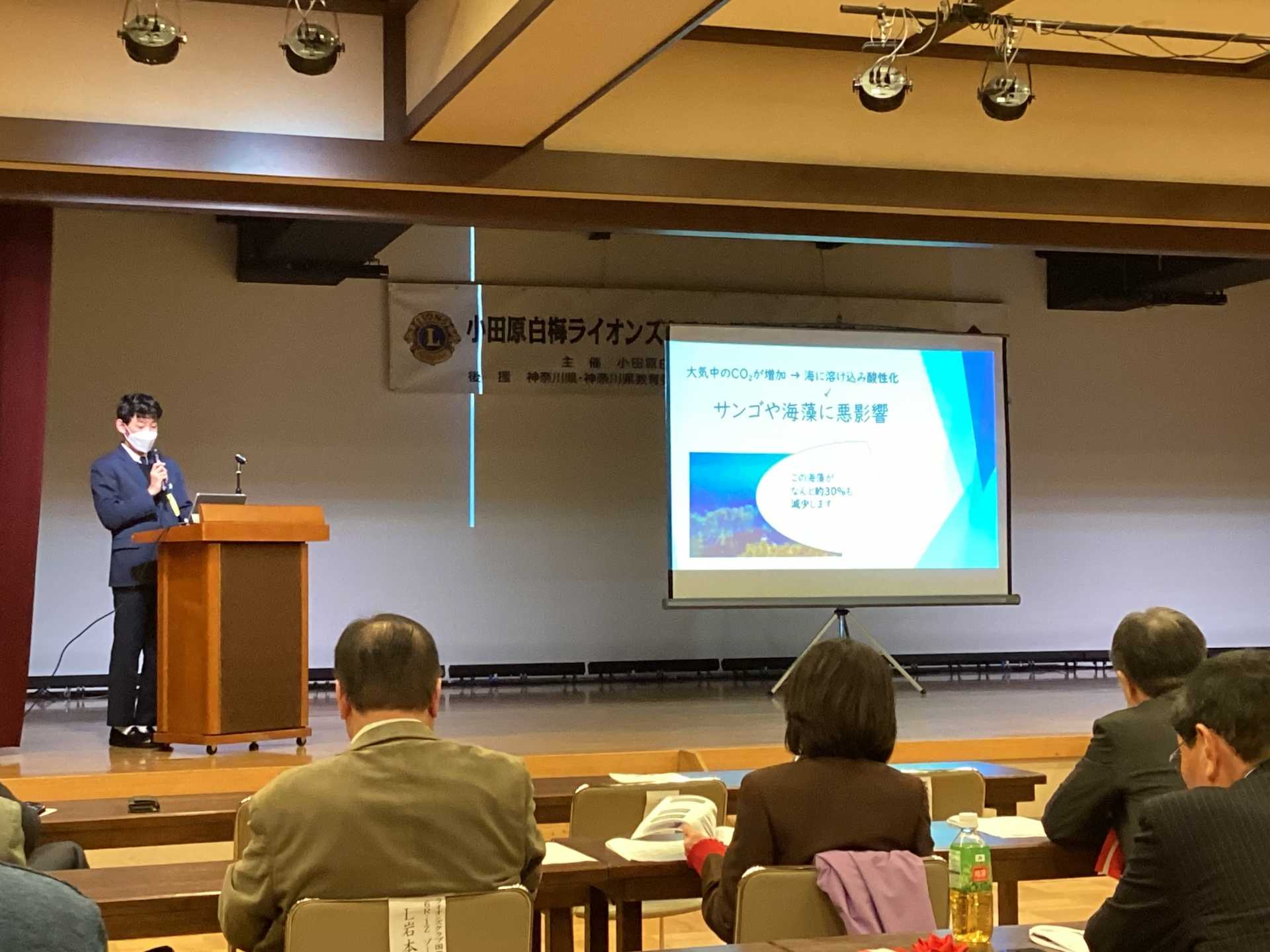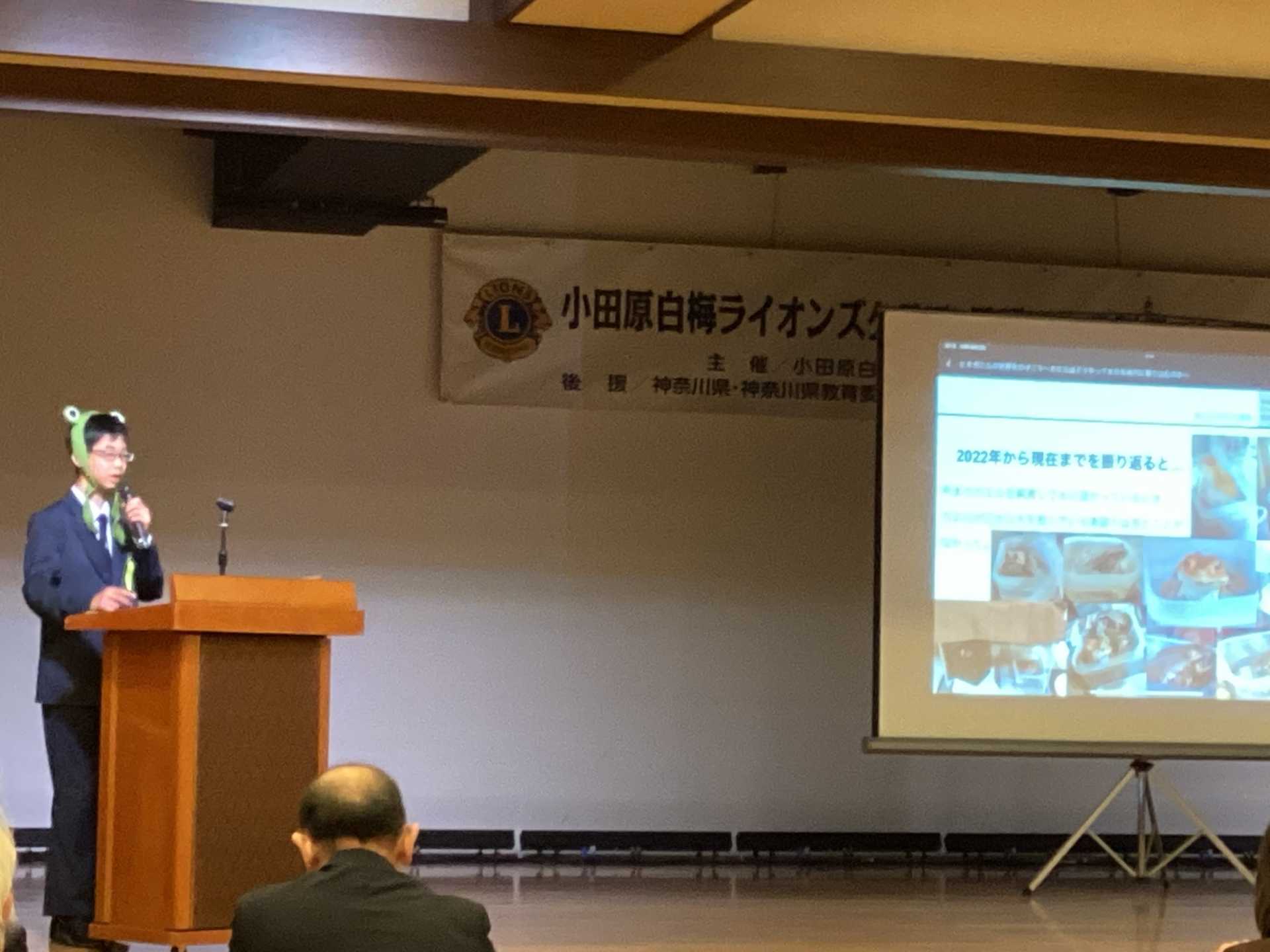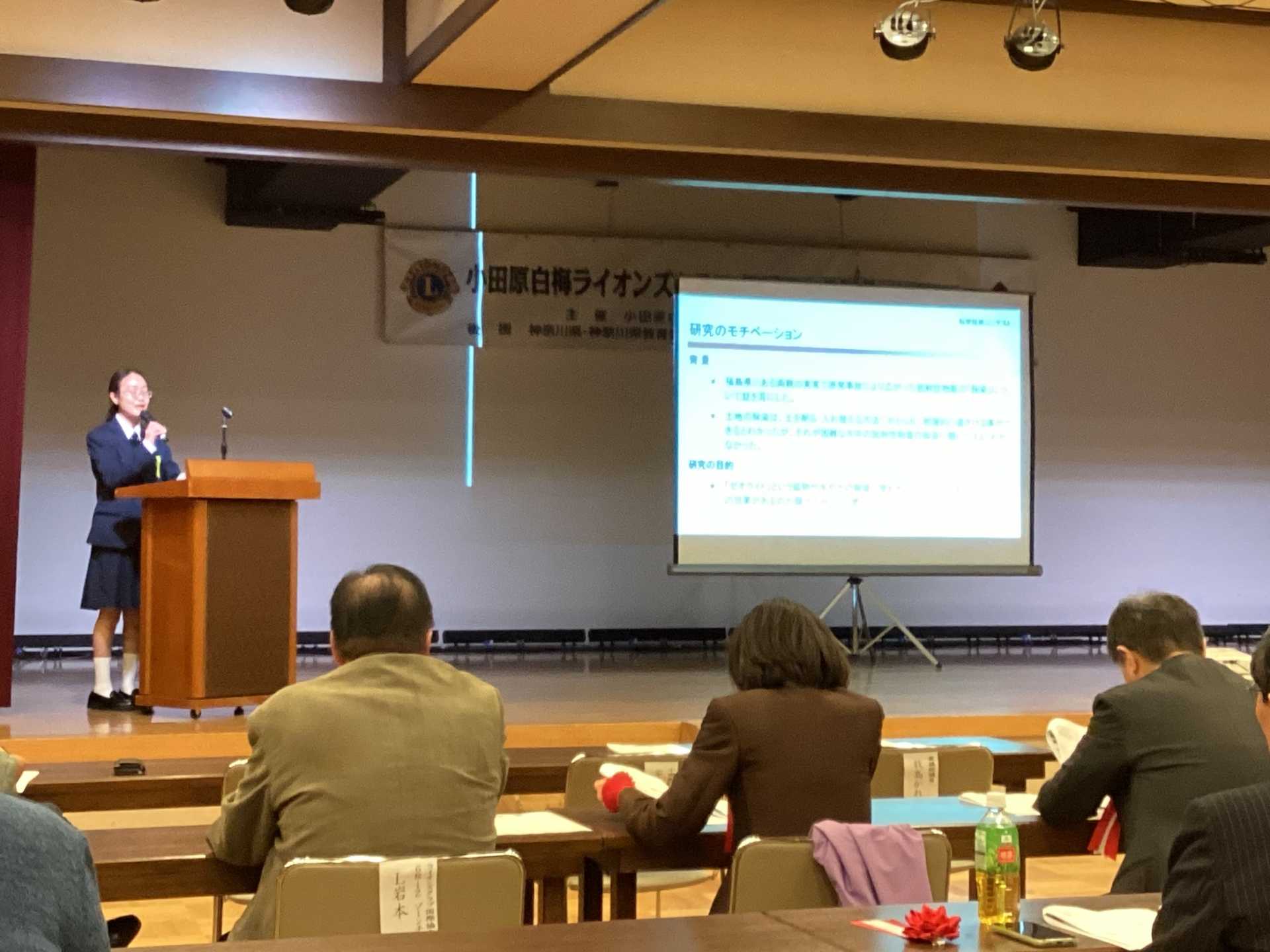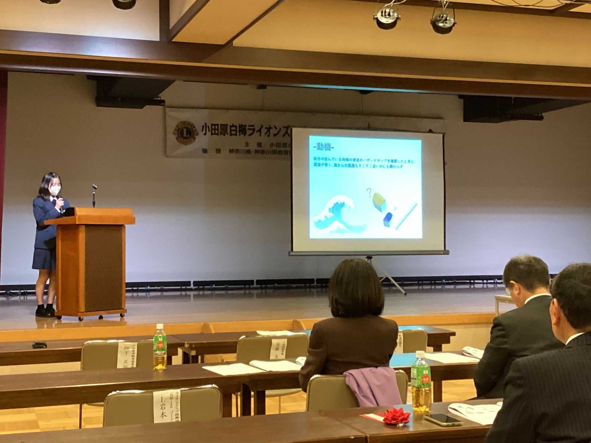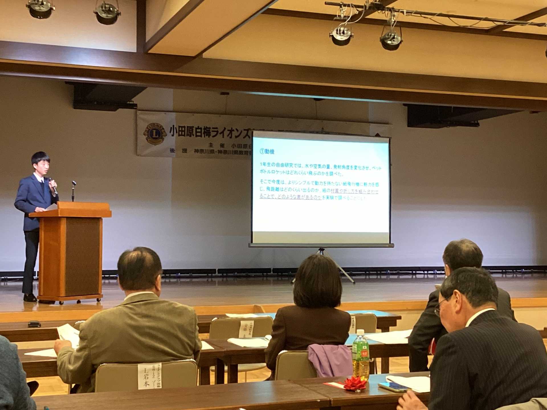 予備審査を通過し集まった小田原市立の学校や県内の私立学校の4団体から13作品が最終コンテストに進み、持ち時間8分、質疑応答8分のプレゼンに挑戦しました。審査員は早稲田大学名誉教授の大石進一先生をはじめとする大学教授8名とライオンズクラブの会長様でした。質疑応答では、大学教授から甘えのない厳しい指摘をもらったり激励をもらったりと、とても貴重な体験ができました。