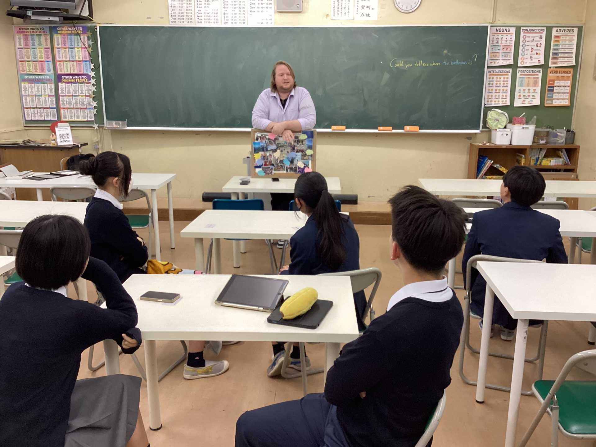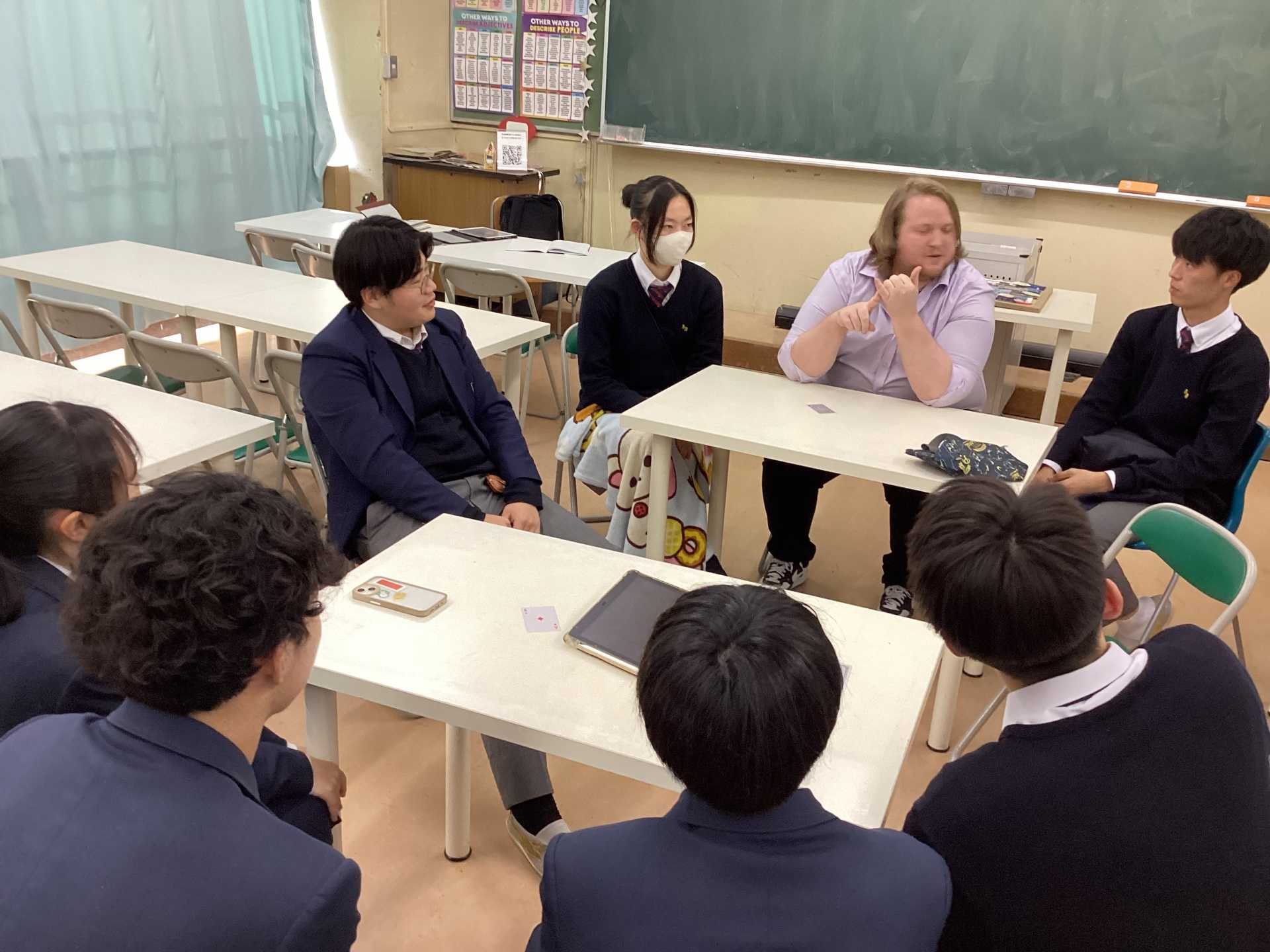 本日は本校のネイティブ教員のコナー先生の指導で英会話のレッスンを行いました。2年前に留学した高校2年生の4人も協力してくれ、ペアになって英会話練習をしたり、留学に向けた心配事や疑問の相談に乗ってくれました。経験者ならではの話を聞かせてくれ、生徒たちはとても真剣な表情で耳を傾けていました。