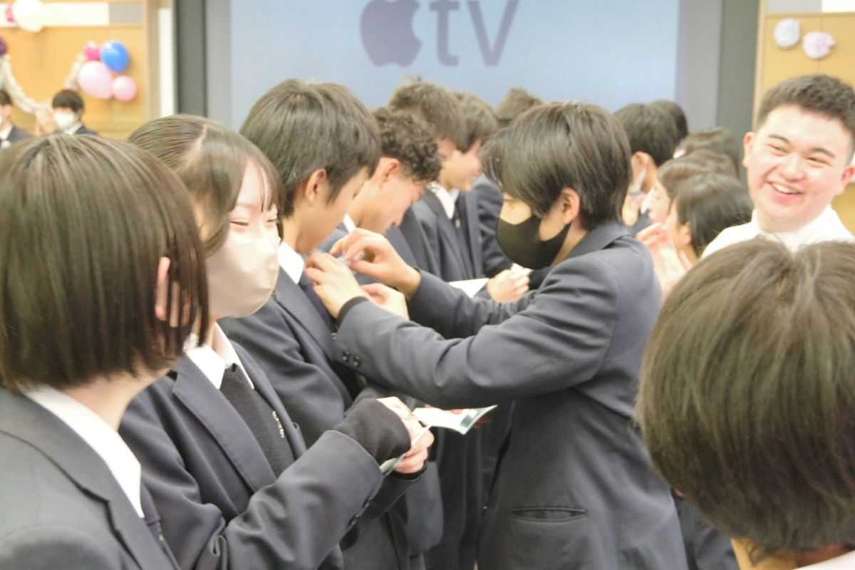 当日に向けて、1・2年生は協力して会場の飾り付けを行いました。また、卒業式で卒業生が胸に付けるコサージュを全員で手作りし、メッセージカードを添えて3年生にプレゼントしました。