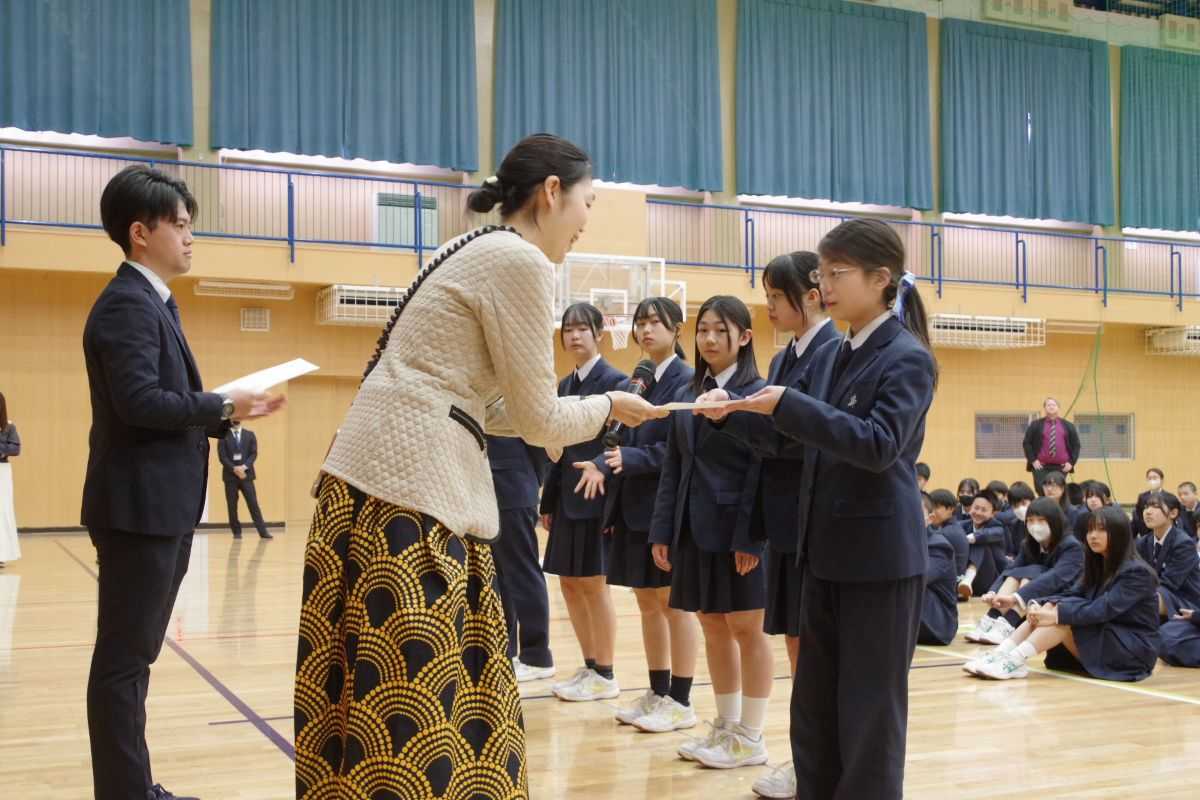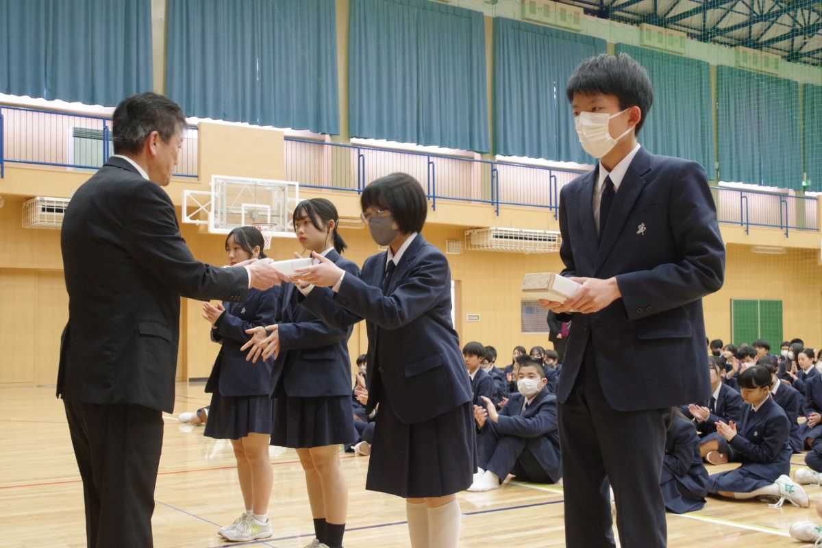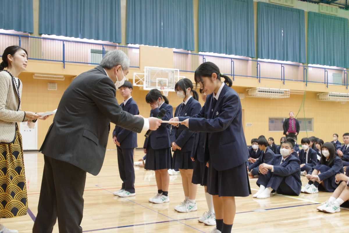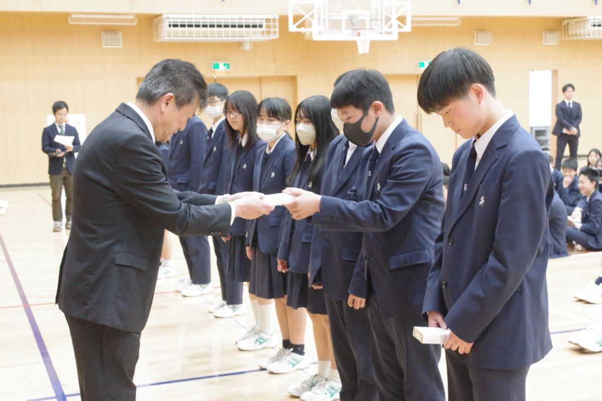 式では、学校長の講話に続き、昨年度1年間にわたり努力を重ねた生徒の表彰が行われました。学習面をはじめ、学校生活全般において最も顕著な努力を示した生徒には「年間努力賞」が授与されました。また、1年間無欠席で過ごした生徒には「年間皆勤賞」が授与されました。